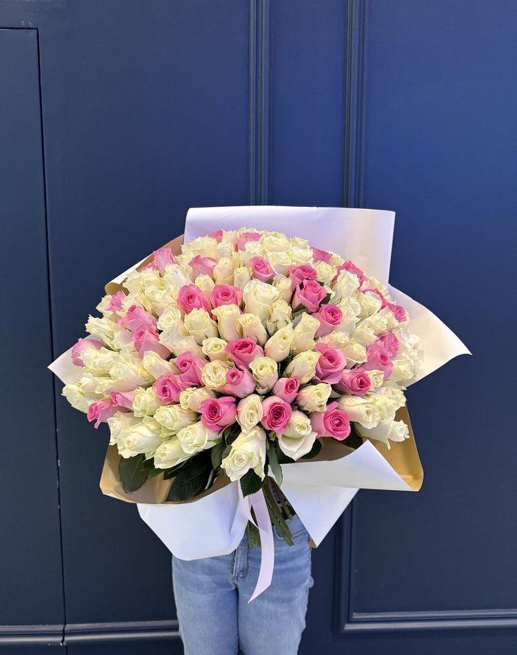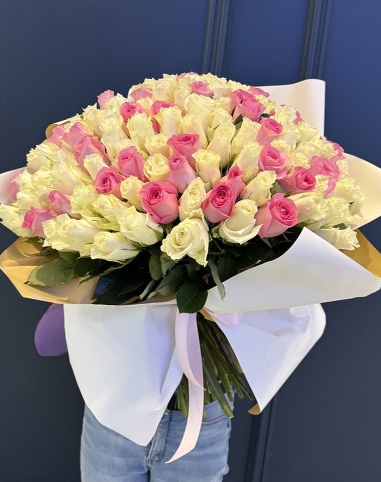 Состав:роза белая - 50, лента - 2, роза розовая - 51, упаковка - 1