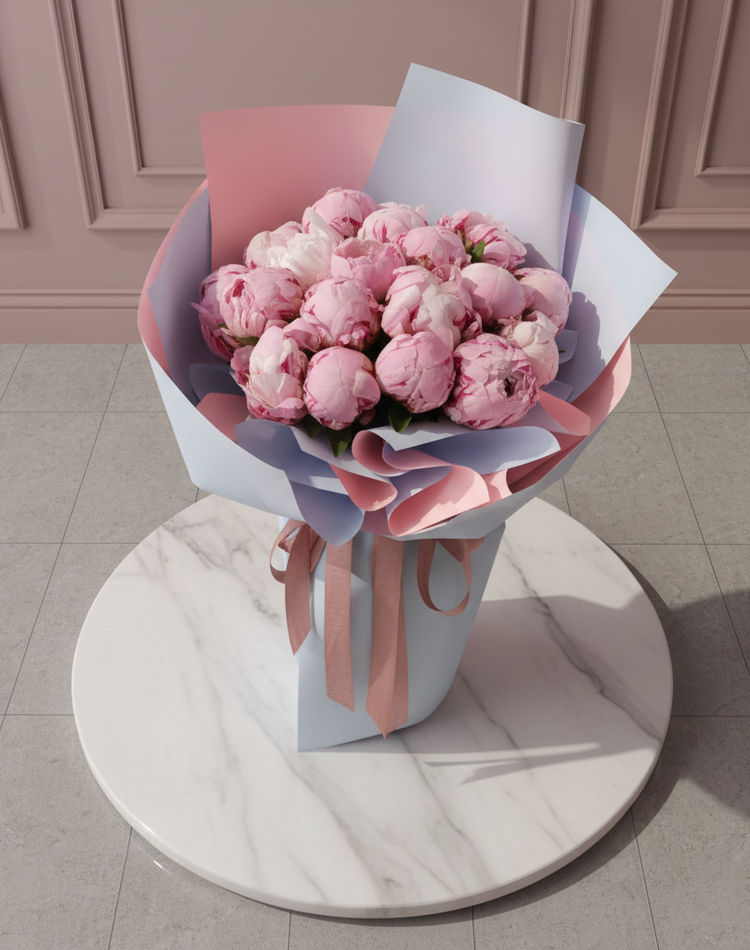 Состав:пион розовый - 19, упаковка - 5, лента - 1