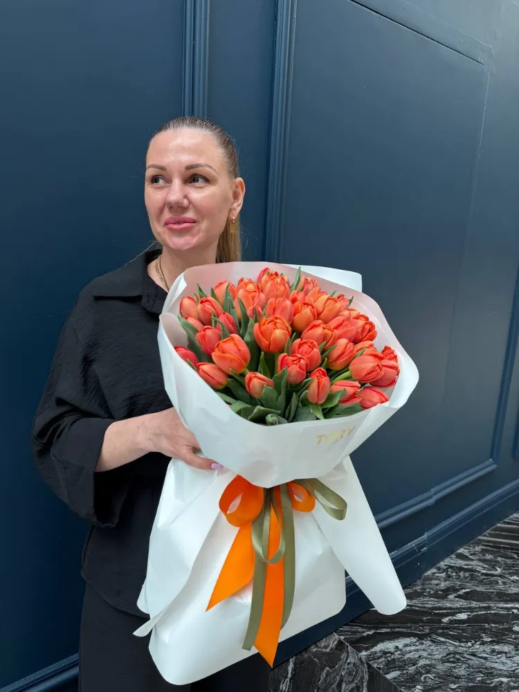 Composition: tulip - 51, wrapping - 5, ribbon - 1