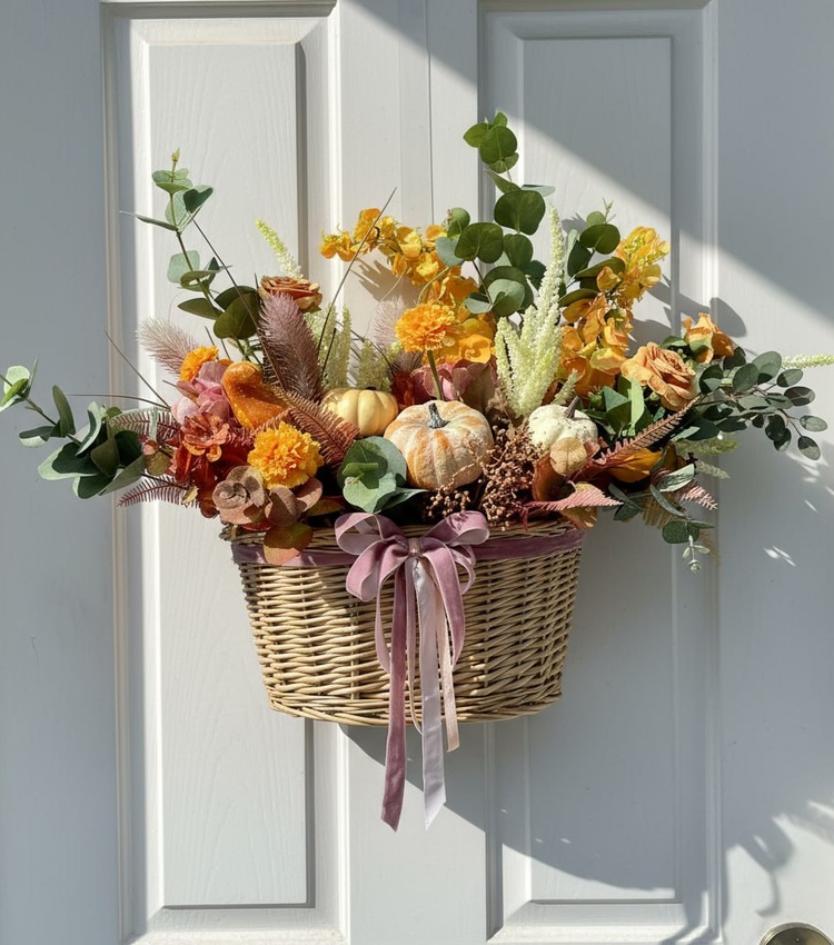 Composition: assorted artificial flowers - 1, pumpkin - 5, basket - 1