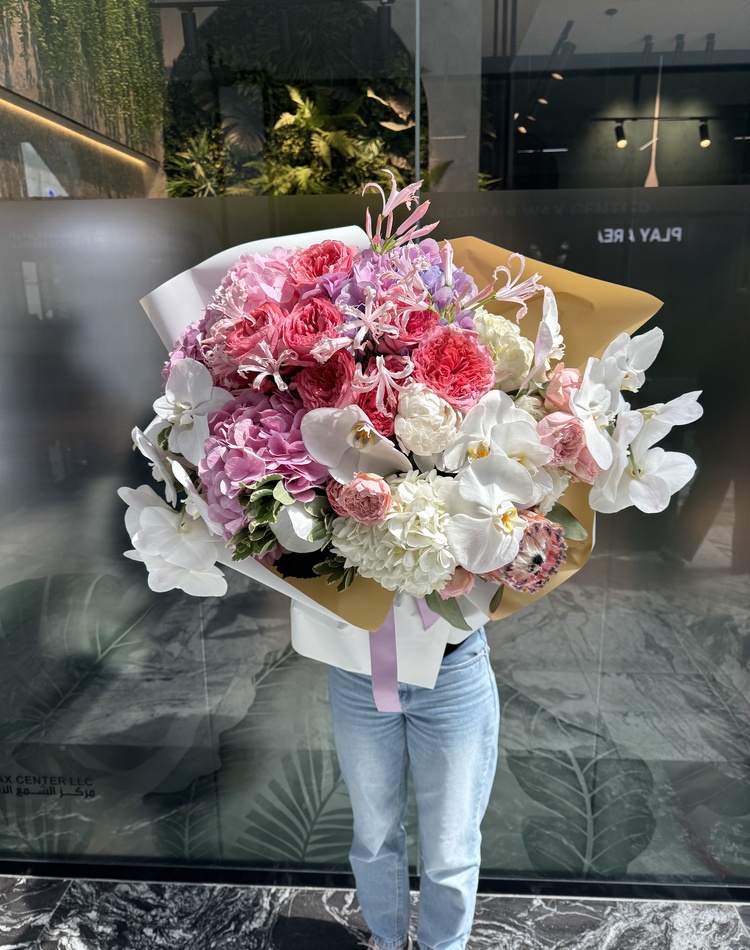 Composition: Protea - 1, Hydrangea - 7, Phalaenopsis - 2, Narine - 5, Rose Pink Expression - 7, Pittosporum - 5, Peony import pink - 1, Spray Rose Julieta peach - 3