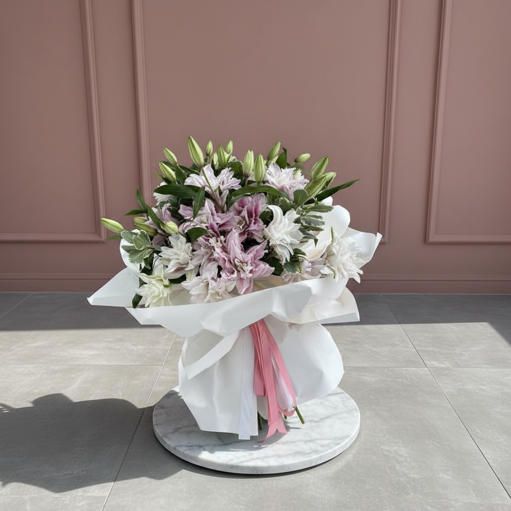Composition: Lily Double Oriental - 15, Pittosporum - 5