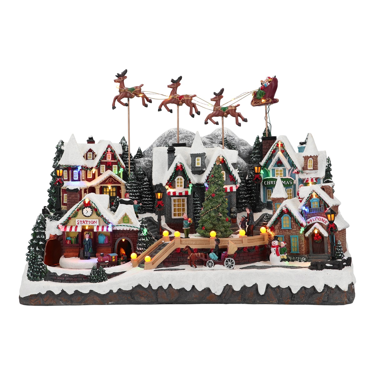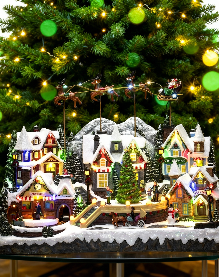 A Christmas village with a moving train, illuminated houses, a rotating Christmas tree, and reindeer flying over the town—a scene full of movement and light that will take your breath away.