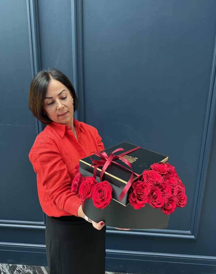 Composition: rose red - 21, box - 1, aroma gift set - 1