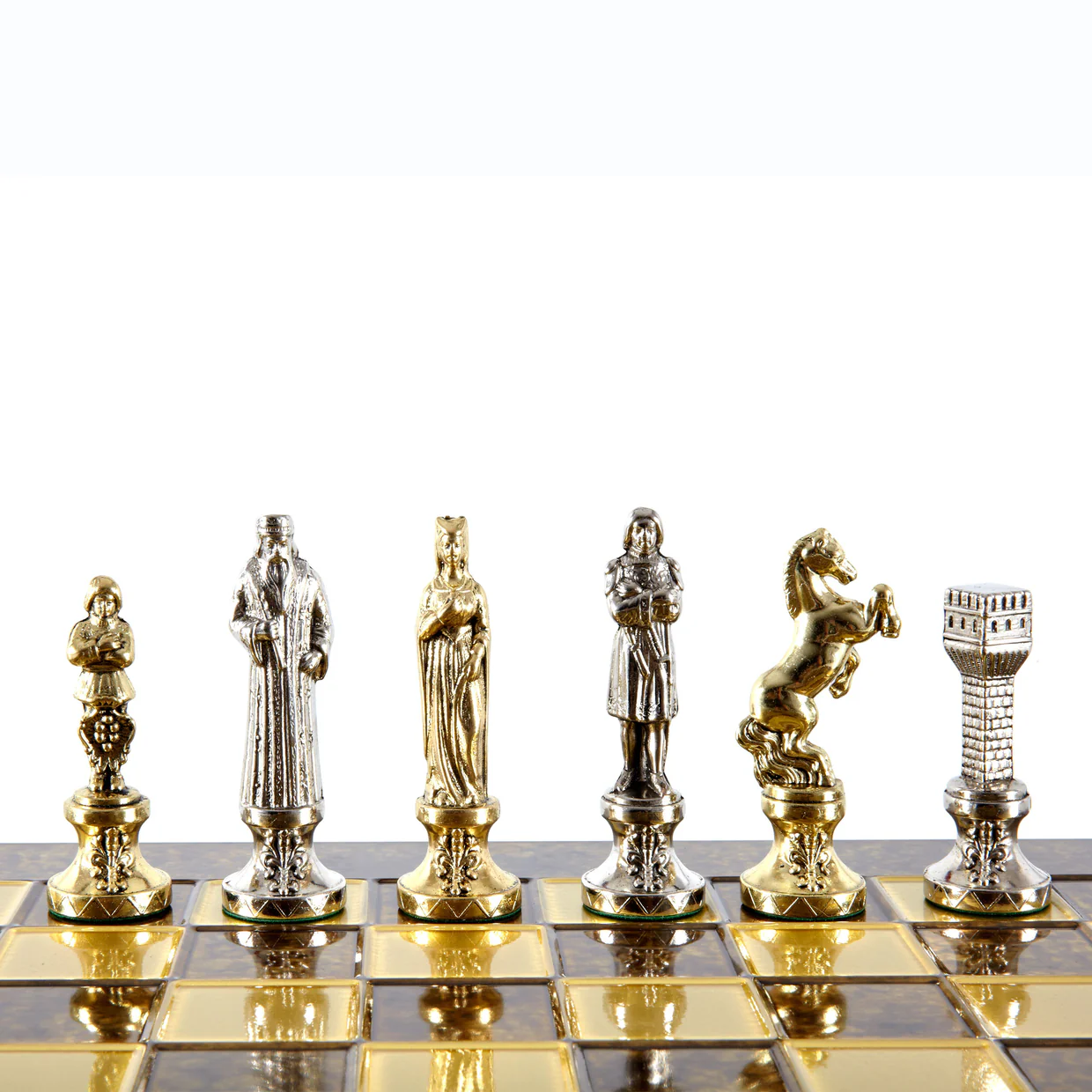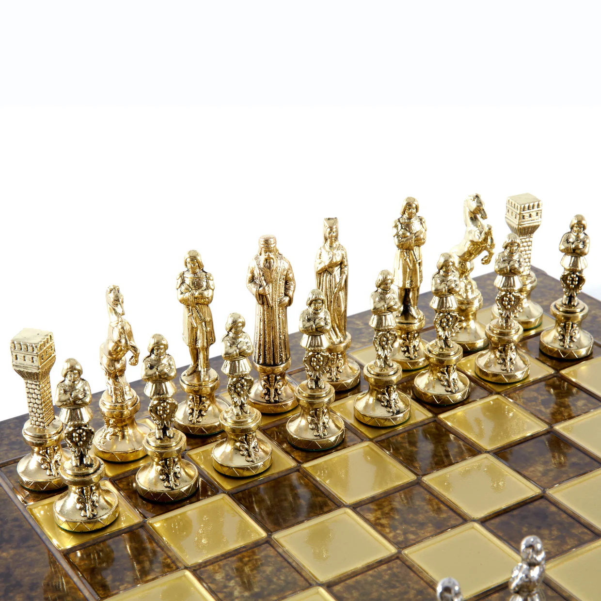 Renaissance Metal Chess set with Gold & Silver Chessmen & 36cm Chessboard in Brown