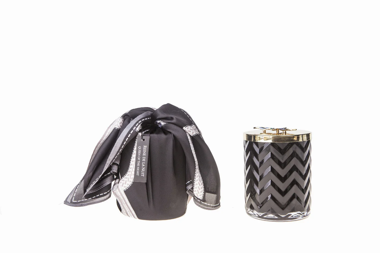 Limited-edition herringbone candles come in a decorative herringbone glass, adorned with an elegant Côte Noire gift box with silk feel scarf.